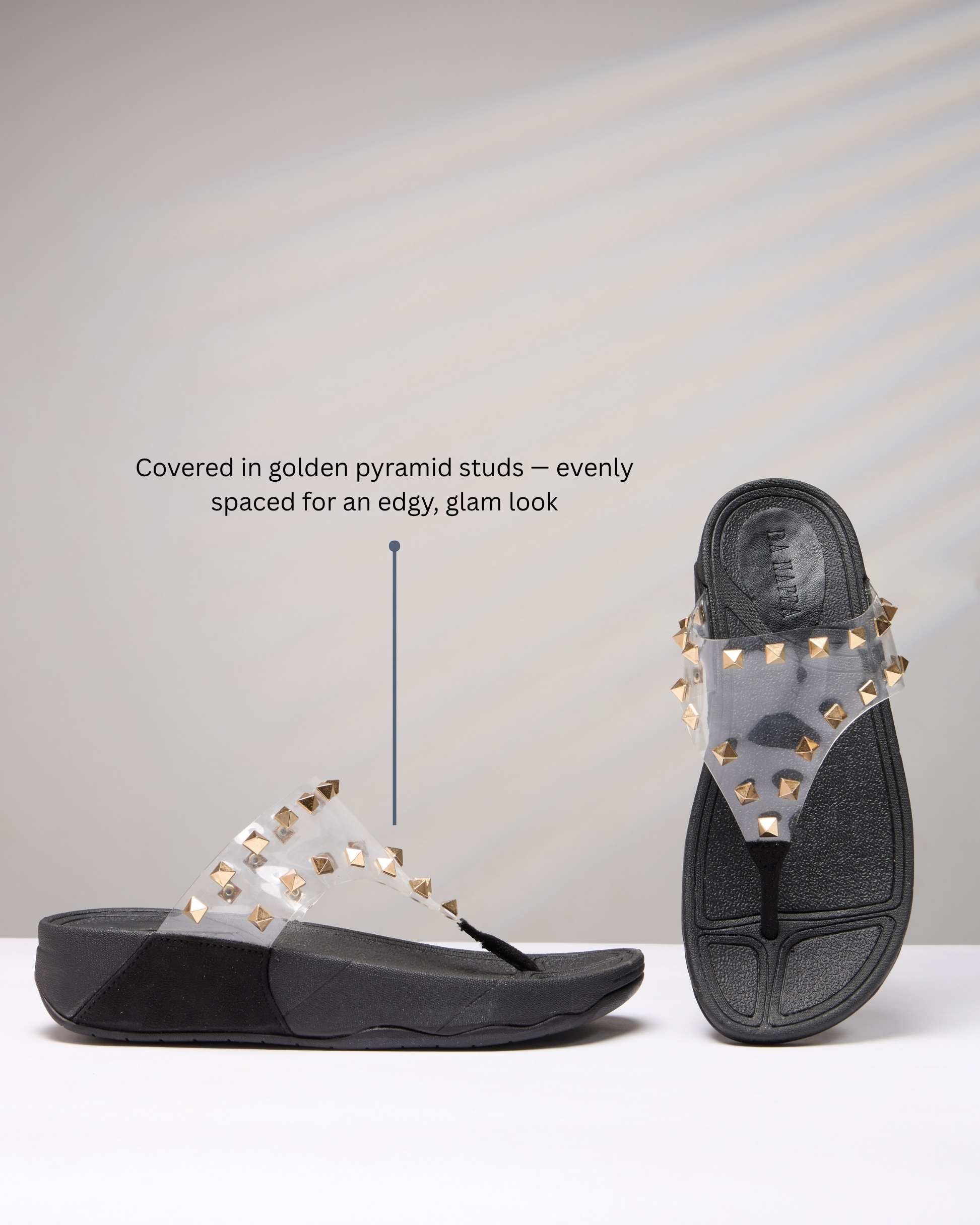 Design : Toe Post Sandal, Embellishments: Covered in golden pyramid studs — evenly spaced for an edgy, glam look.