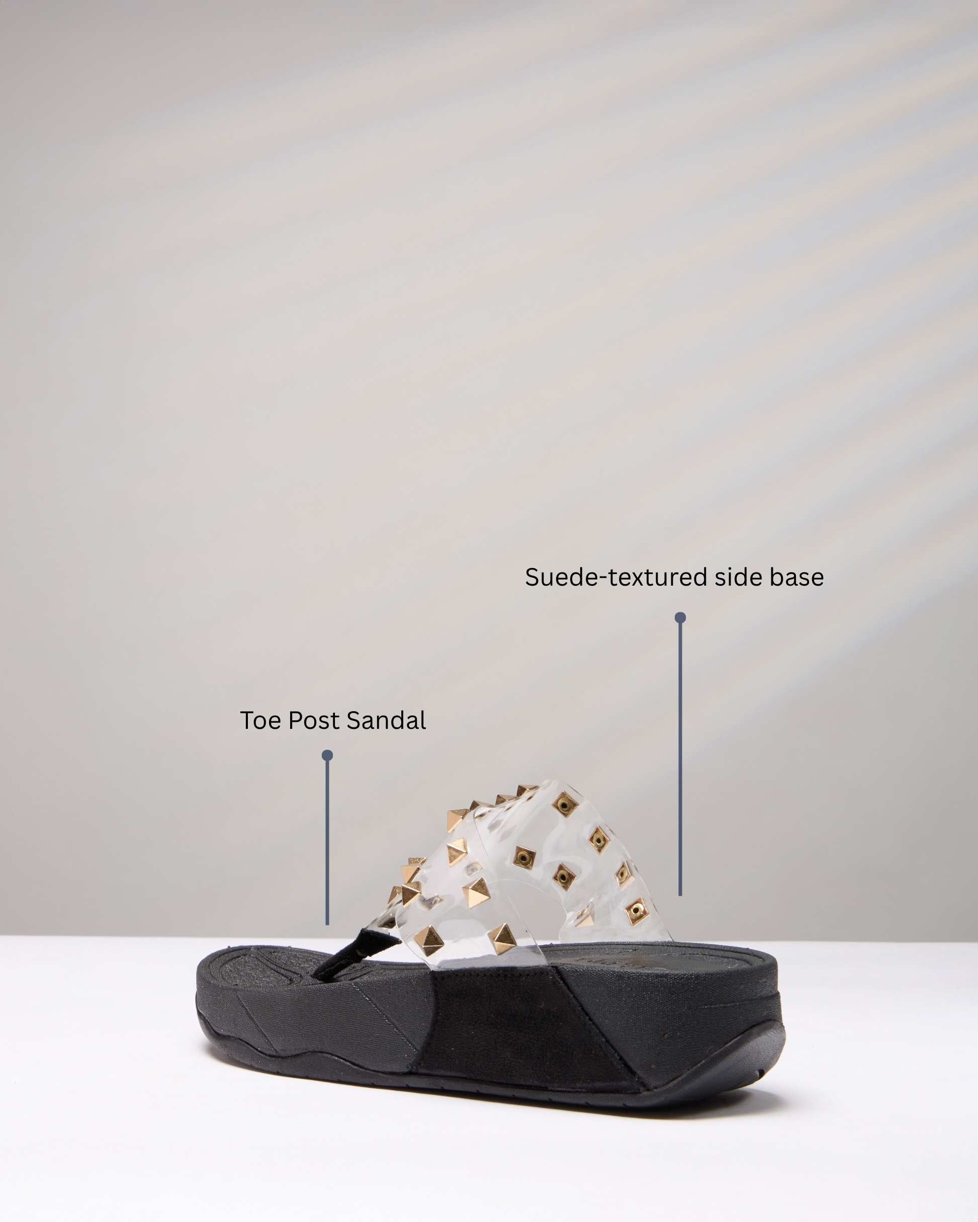 The Suede Spike is designed for the trend-forward woman who loves a mix of elegance and edge. Built on a soft matte sole with suede-like finish on the sides, this sandal features a transparent upper strap scattered with luxe gold pyramid studs — balancing clarity and contrast in one powerful silhouette.